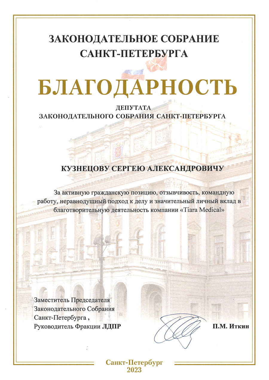 Выражаем искреннюю благодарность Вашей компании. “Tiara Medical” проявила себя как надежный поставщик медицинского оборудования. Хотим отметить комплексный подход к решению вопросов поставки медицинского оборудования для сети наших клиник в Санкт-Петербурге.