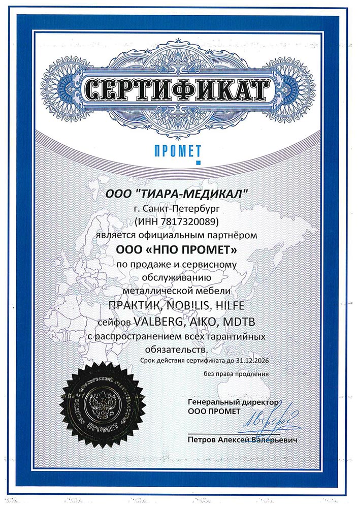 ТИАРА-МЕДИКАЛ осуществляет продажу медицинского оборудования, инструментов и материалов в соответствии с законодательством РФ. Наше оборудование имеет всю необходимую разрешительную документацию, гарантию производителя и продавца.